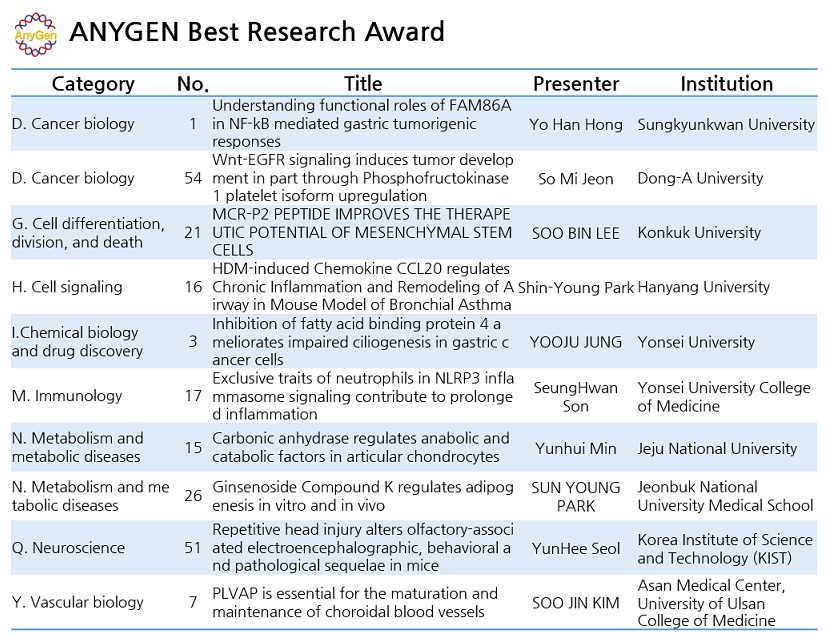 이번 수여식은 지난 달 제21차 한국조직공학·재생의학회 애니젠 여성과학자상 수여식에 이어 세번째로 진행되었으며, 애니젠 우수포스터상은 홍요한 외 9명의 연구자들에게 수여되었습니다.